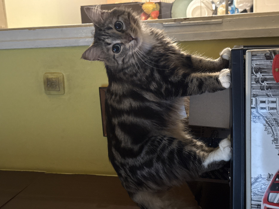 The scene is an indoor residential location in Berkovitsa, Bulgaria. A domestic medium-haired tabby cat, exhibiting dark brown and grey striped markings over a lighter fur base, stands on all four paws atop a dark, flat surface. The cat's head is turned towards the viewer, displaying prominent whiskers and large, rounded, blue-green eyes with dilated pupils. Its front and hind paws are white. The dark surface the cat occupies is the top of an appliance, possibly a refrigerator. Below this surface, a visible panel features a black-and-white illustration of an urban street scene with architectural buildings, a red double-decker bus, and a miniature red British telephone booth. The background consists of a light lime-green painted wall. A light-colored electrical outlet is affixed to the upper right portion of this wall. To the immediate right of the cat, an off-white doorframe or opening provides a partial view into an adjacent room, where a bowl containing red, yellow, and orange fruit, along with stacked white dishes, is visible. The environment is illuminated, suggesting typical indoor lighting conditions.