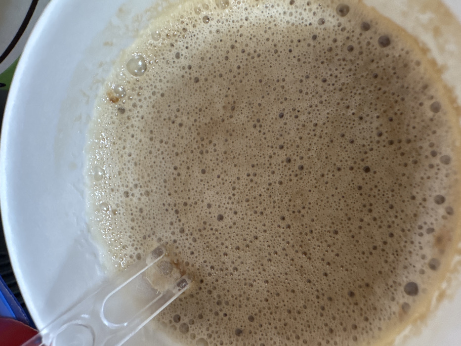 - "A close-up, top-down view depicts a light brown, frothy beverage contained within a white cup" by FM-tFDjG2, licensed under CC BY 4.0