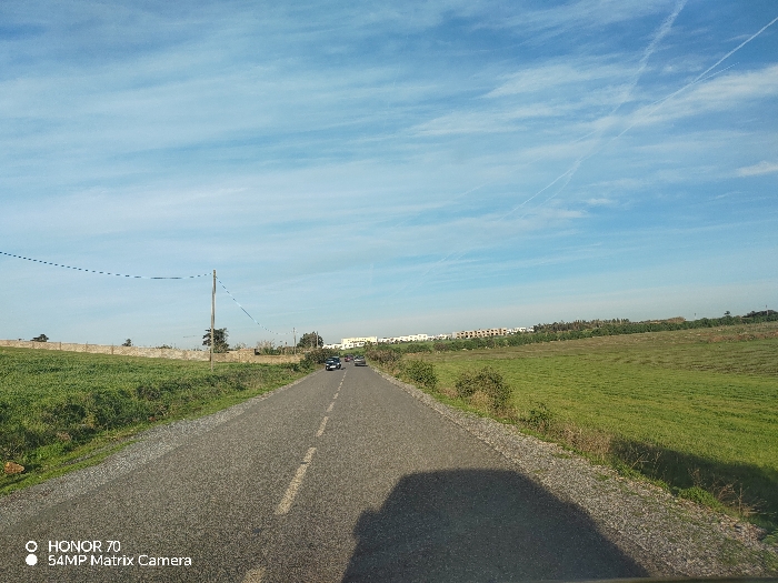 A road stretches through a rural landscape under a blue, streaked sky. Green fields border each side, punctuated by a stone wall on the left. In the distance, buildings are visible. Several cars travel along the asphalt road, marked by a single white line. A utility pole stands on the left side, carrying electrical lines. The image is captured with an HONOR 70 54MP Matrix Camera, as indicated by the watermark.