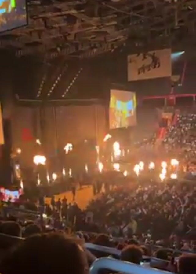 large indoor arena filled with people, likely attending a concert or a show. There's a stage with large screens displaying visuals. Pyrotechnics are being used, with flames shooting up from the stage. The crowd is cheering and holding up their phones with the flashlights on, creating a sea of light. The lighting and effects are creating a dynamic and energetic atmosphere.