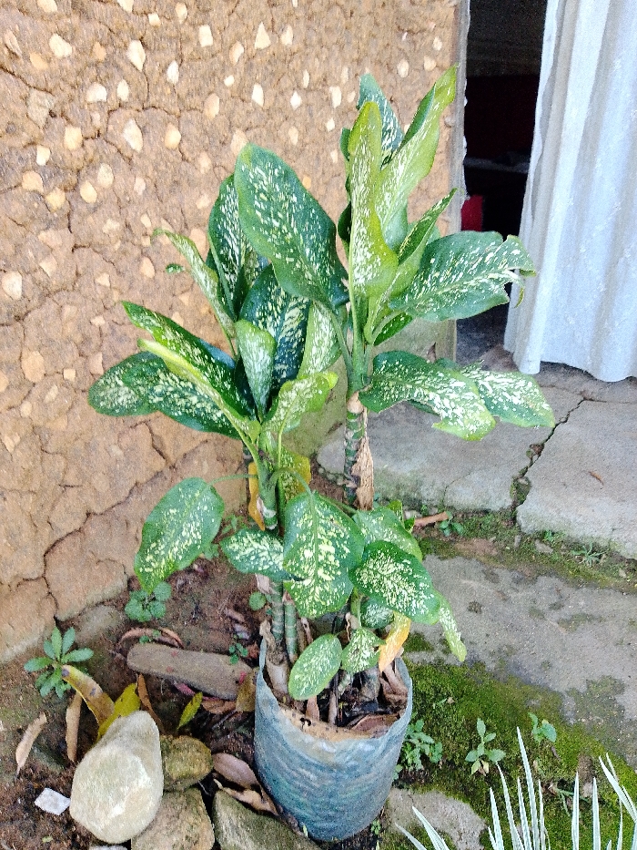 A potted Dieffenbachia plant stands near a textured wall, possibly stucco, with a mix of small and large leaves displaying mottled green and white patterns. The plant's container is a dark, rough material. Rocks are scattered around the base, and some small green plants grow nearby. The setting appears to be outdoors, near a building or entrance, with a partial view of a white curtain or fabric. Moss and other vegetation are visible on the ground around the plant.