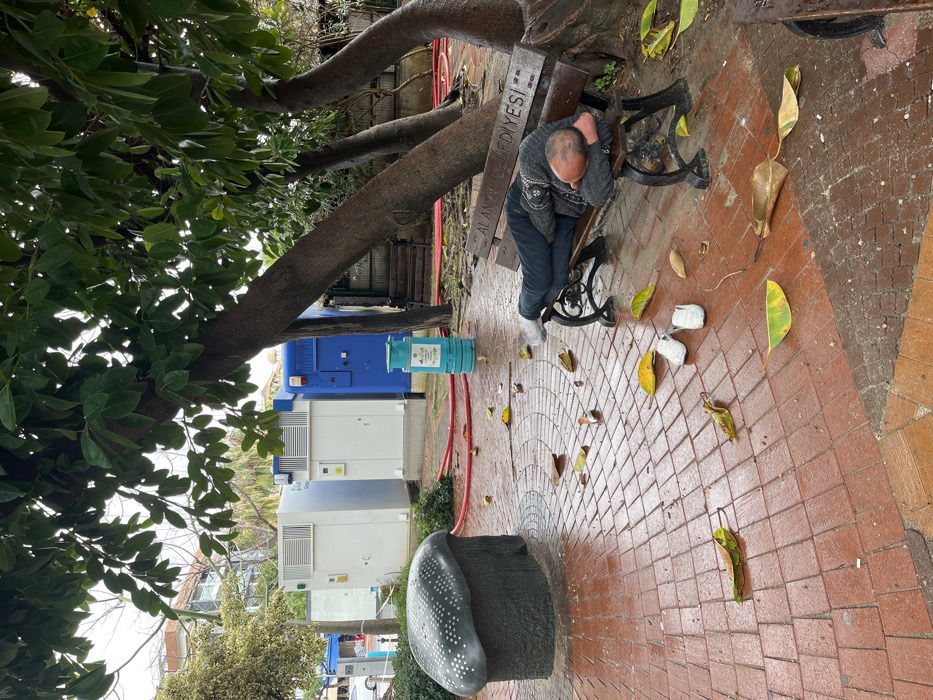 An outdoor scene in Alanya, Turkey, depicts a man sleeping on a park bench under trees on a wet, tiled pavement