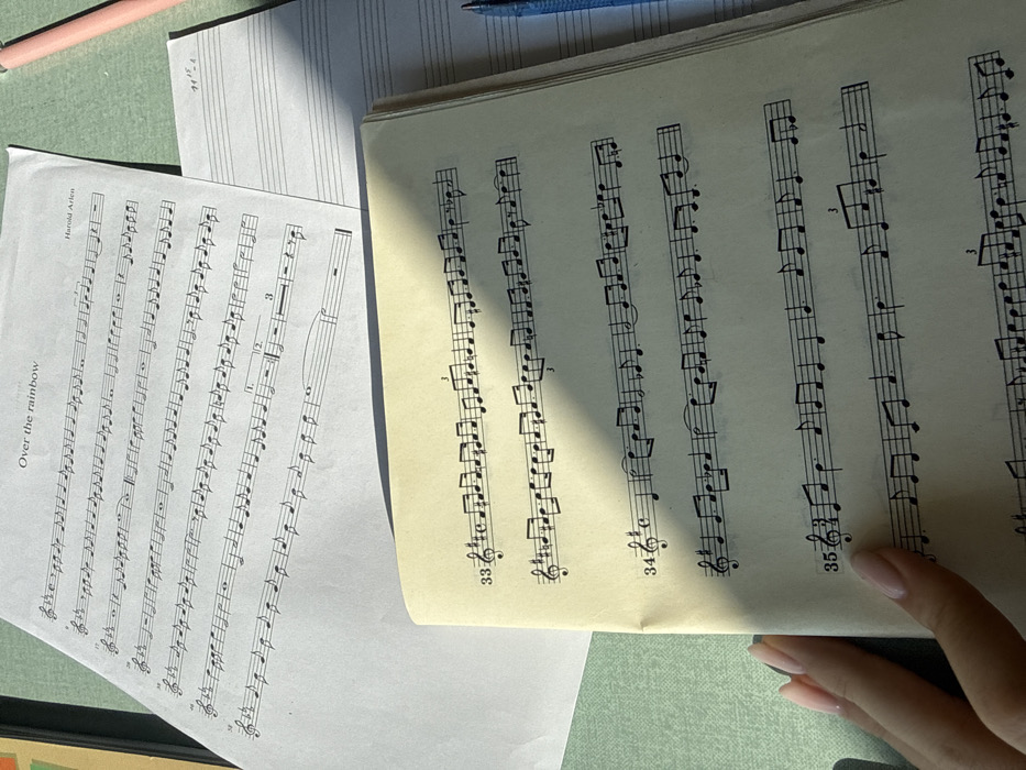 The scene depicts a tabletop view in Sofia, Bulgaria, featuring an arrangement of musical scores under strong, natural lighting. In the foreground, a left hand with manicured nails holds the aged, cream-colored page of an open music book, revealing printed musical notation with measures numbered 33, 34, and 35. Overlapping this book in the background is a white sheet of paper displaying the title "Over the rainbow" by Harold Arlen, also covered with musical notation. To the right of the white sheet, a piece of blank staff paper is partially visible, upon which rests a pink pencil and the tip of a blue pen. All items are situated on a textured, light green surface. A prominent diagonal shadow bisects the upper portions of the music book and the white sheet, indicating a light source from the upper right of the frame. The overall arrangement suggests a study or practice session related to music.