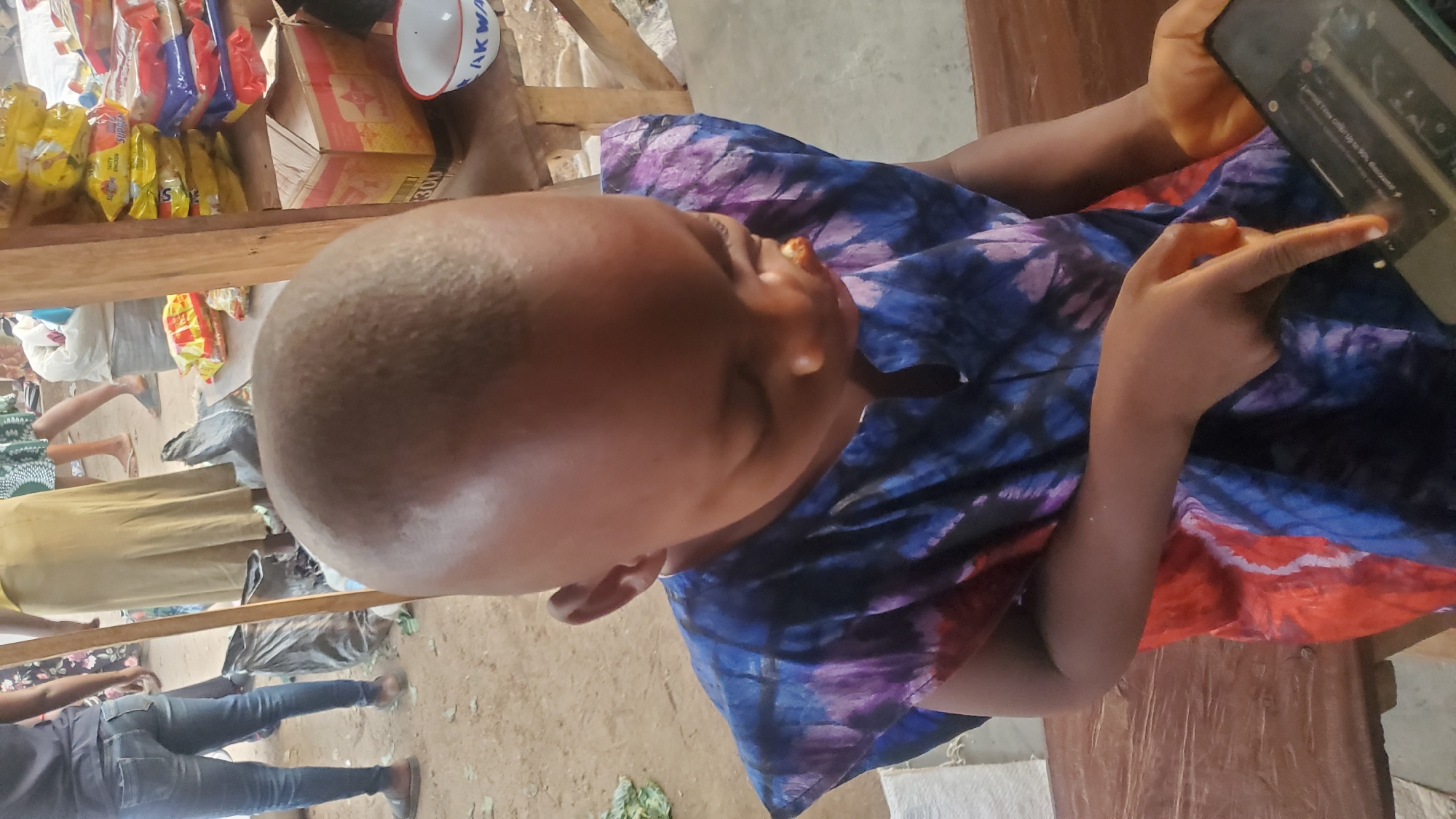 A young child with a bald head, wearing a blue, purple, and red patterned tunic, is seated on a dark wooden surface, looking down at and interacting with a black smartphone using their right index finger. A small amount of food residue is visible on the child's upper lip. The scene is an outdoor market in Akwanga, Nigeria. In the background, multiple adults are partially visible from the waist down on a dirt ground, including one person in blue jeans and another in a long tan skirt. Behind them, wooden market stalls display various packaged items, including stacked yellow bags labeled "TASTY CHICKEN" and other products in red and blue packaging. A brown cardboard box and a white ceramic bowl with "AKWA" written in blue lettering are present on a lower shelf of a stall. Dark plastic bags and green leafy refuse are scattered on the ground.