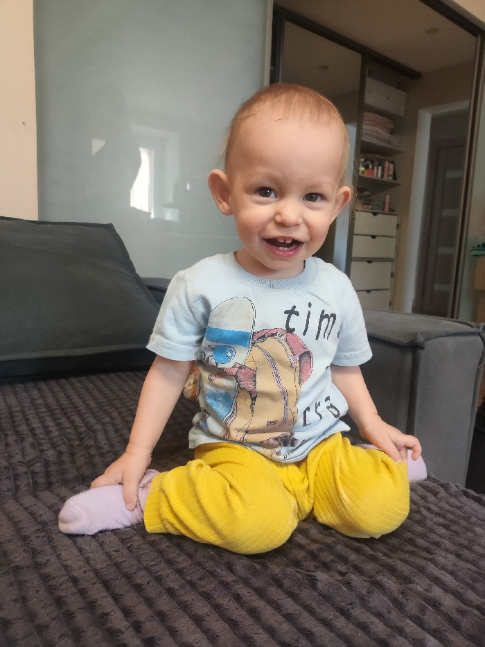 A toddler with light, sparse hair, wearing a light blue t-shirt featuring a multi-colored graphic of a figure with a skateboard and backpack, yellow ribbed pants, and light purple socks, is seated upright on a dark grey textured blanket or throw. The child's mouth is open in a wide smile, exposing teeth. The child's hands rest on their thighs. Portions of a dark grey upholstered sofa are visible to the child's left and right. The background features a light-colored wall. To the left, a large frosted sliding wardrobe door reflects a window and a vague human silhouette. To the right, a mirrored sliding wardrobe door reflects an interior room with shelves displaying neatly folded items and various bottles. This indoor scene is situated within a private residence in Chaikovsky, Russia.
