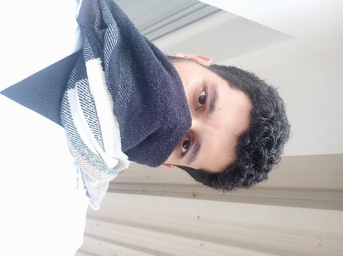 This image, taken in Gueznaïa, Morocco, presents a close-up, low-angle view of a male individual. The subject has dark, curly hair and brown eyes, looking directly towards the camera. A dark navy blue and white patterned scarf covers his lower face, concealing his nose and mouth. He wears a white outer garment over a dark inner layer, visible at the neckline. The immediate background to the upper left features a plain light-colored wall or ceiling corner. To the right, a light-colored corrugated metal structure with vertical ridges is visible. The scene is illuminated by diffuse, even lighting.