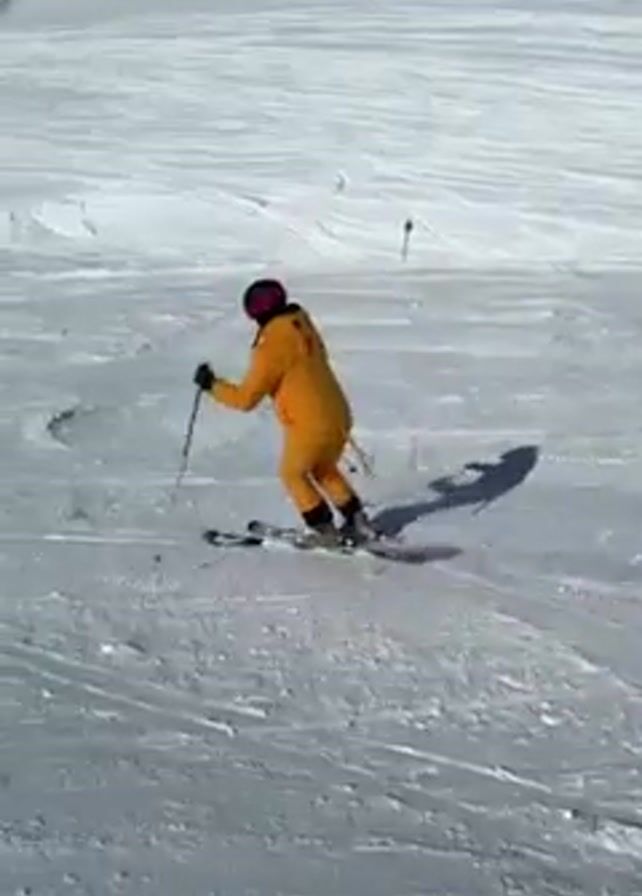 person skiing down a snowy slope on a bright, sunny day