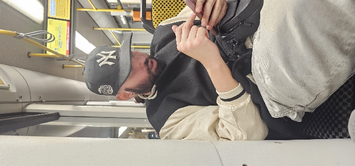 - "A man wearing a baseball cap with the New York Yankees logo, a jacket, and gray pants is sitting on public transportation" by FM-pDwWG2, licensed under CC BY 4.0