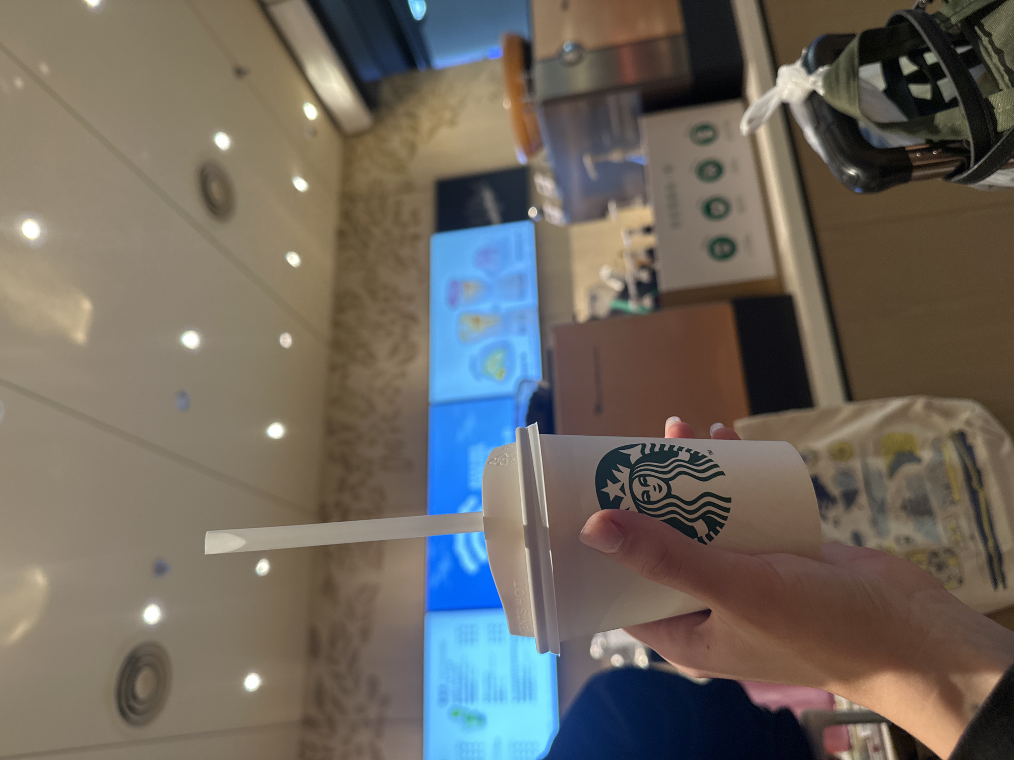 The image depicts the interior of a Starbucks cafe in Xiaoshan District, China. In the foreground, a human hand, appearing feminine with manicured nails, holds a white paper Starbucks cup. The cup features the prominent green Starbucks siren logo, and a white paper lid with "ENTS HOT" embossed on it, from which a white paper straw protrudes vertically. Behind the hand and cup, the cafe interior is visible. A commercial counter spans the midground, equipped with stainless steel components, various dispensers, and a white rectangular sign displaying four green circular icons. Above the counter, three brightly illuminated digital menu boards present graphical and textual information, with blue and white being dominant colors. The walls behind these displays have a light-colored, textured pattern. The ceiling is white, fitted with multiple recessed circular light fixtures and at least one circular air vent. In the lower right portion of the frame, the black, extendable handle of a piece of rolling luggage is visible, with a green and camouflage-patterned bag, secured by a black strap, and a tied clear plastic bag attached to it. Below the central cup, a light-colored tote bag with blue and yellow illustrations is partially visible. The overall scene is well-lit by internal ambient and direct lighting, indicating a public commercial establishment.
