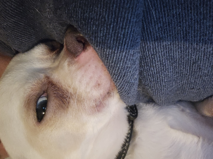 - "A close-up image captures a small, white-furred dog, its left eye partially open and directed towards the viewer" by FM-dTRWD3, licensed under CC BY 4.0