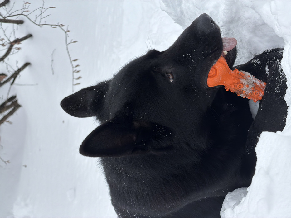 In Прикамский, Russia, a black canine, consistent with a large breed, is observed in a prone position in a snow-covered outdoor environment. The animal is actively chewing an orange, textured dog toy, which is partially inserted into its mouth. The toy exhibits white crystalline material, consistent with snow or saliva, adhered to its surface. A portion of the canine's pink tongue is visible. Small flakes of snow are present on the canine's dark fur, particularly on its head and back. The background consists of a blurred winter scene featuring deep white snow and sparse, bare tree branches.