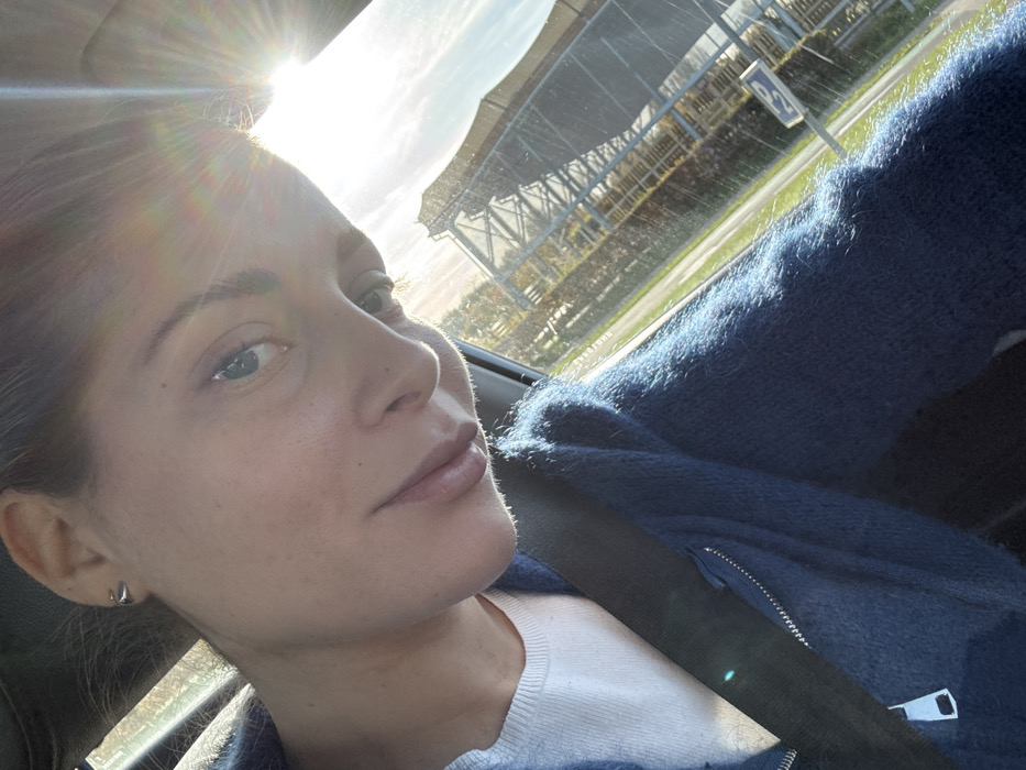 A female individual with light skin, dark hair, and blue eyes is depicted from the chest up, positioned as if taking a selfie from within a vehicle