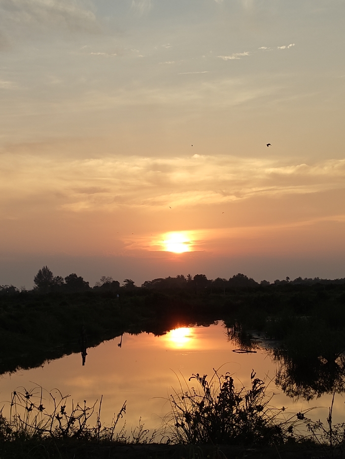The image displays a sunset scene over a rural landscape in Mesjid Tuha, Indonesia. The sky transitions from a light grey-blue at the top to vibrant orange and yellow hues near the horizon, populated by scattered, horizontally oriented clouds. The sun, a bright yellow-orange disc, is centrally positioned on the horizon, partially obscured by thin cloud cover. Its intense light is reflected as a prominent, elongated yellow-orange streak across a still body of water that occupies the lower half of the frame. The foreground consists of dark, silhouetted foliage, including grasses and shrubs, bordering the water. In the midground, a dark, undulating treeline or dense vegetation forms the distant horizon, appearing as silhouettes against the colorful sky. Several small, dark avian silhouettes are visible in various positions across the upper sky, indicating birds in flight. A faint, dark vertical reflection of an unseen object is discernible in the water on the left side. No human figures or overt man-made structures are present.