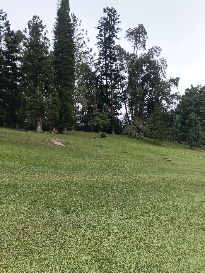 The image presents an outdoor scene within Kadoma, Zimbabwe, characterized by a sloping expanse of well-maintained green grass under an overcast sky. In the foreground and midground, vibrant green turf covers the ground, ascending gently towards the background. Several small, rounded rocks are sparsely distributed across the grassy slope. In the midground, slightly to the left of the center, a solitary individual is visible, seated on the grass near the base of a large, dark green conifer tree. The individual appears to be wearing light-colored clothing, possibly yellow or beige, with darker lower garments. Their specific actions or interactions are not discernible due to distance and image resolution. The background is dominated by a dense collection of tall trees, including various conifers and broadleaf species, forming a dark green treeline against the uniformly light gray sky. No other subjects or objects of significance are identifiable.