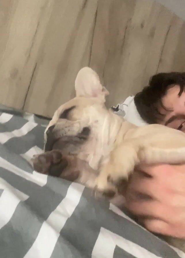 - "A person is lying on a bed with a French bulldog" by FM-SIy123, licensed under CC BY 4.0