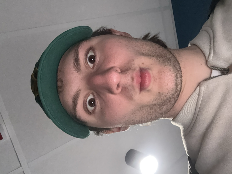 This image captures a close-up, low-angle indoor portrait of a male in Novate Milanese, Italy. The subject, a young adult male with brown, slightly curly hair, is wearing a green baseball cap with a dark emblem partially visible on the front, and a light-colored, possibly beige or off-white, zipped jacket over a white garment. His eyes are wide open, directed towards the camera, and his lips are pursed in a distinctive, exaggerated expression. Light stubble is visible on his jawline and chin. The immediate background consists primarily of a white ceiling. A circular, white light fixture with a black base is positioned high on the left side of the frame, emitting bright illumination. A section of a light blue wall is discernible on the far right edge of the image. No other individuals or significant interactions are visible.