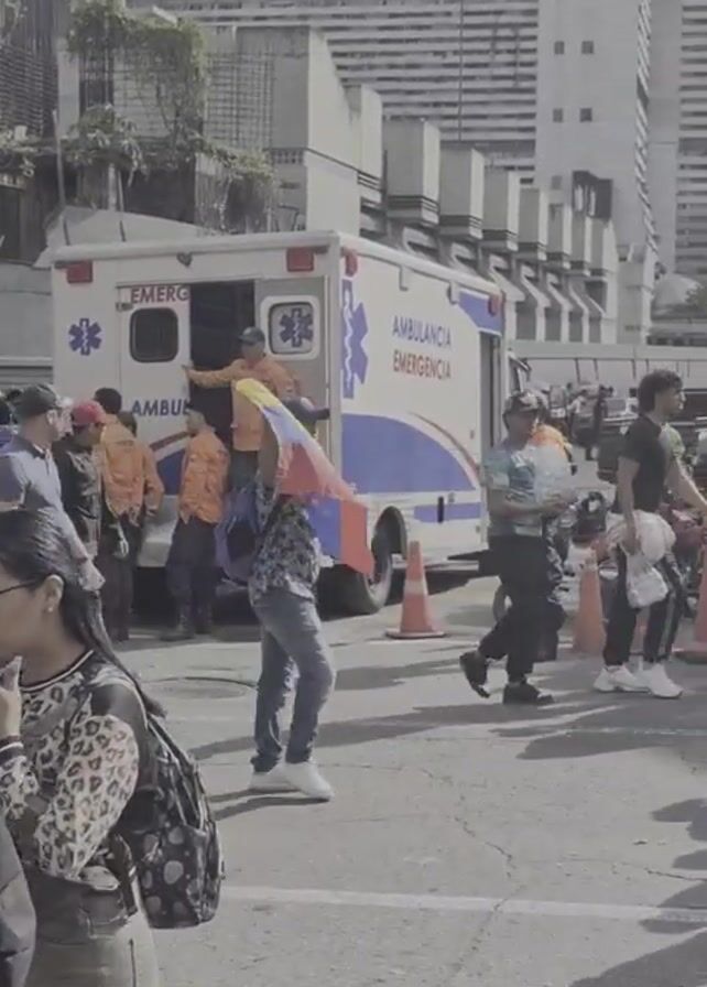 bustling street scene with people walking and an ambulance parked. In the beginning, a man in an orange shirt is seen standing in the open back of the ambulance. Several people are walking by, some carrying the flag of Venezuela. As the video progresses, the camera pans slightly to reveal a group of police officers on motorcycles. They are wearing dark uniforms with the letters "CPNB" on their backs. More people are walking by, some carrying flags. The overall impression is of a busy area with a mix of emergency services and possibly some kind of gathering or demonstration. The buildings in the background suggest an urban environment.