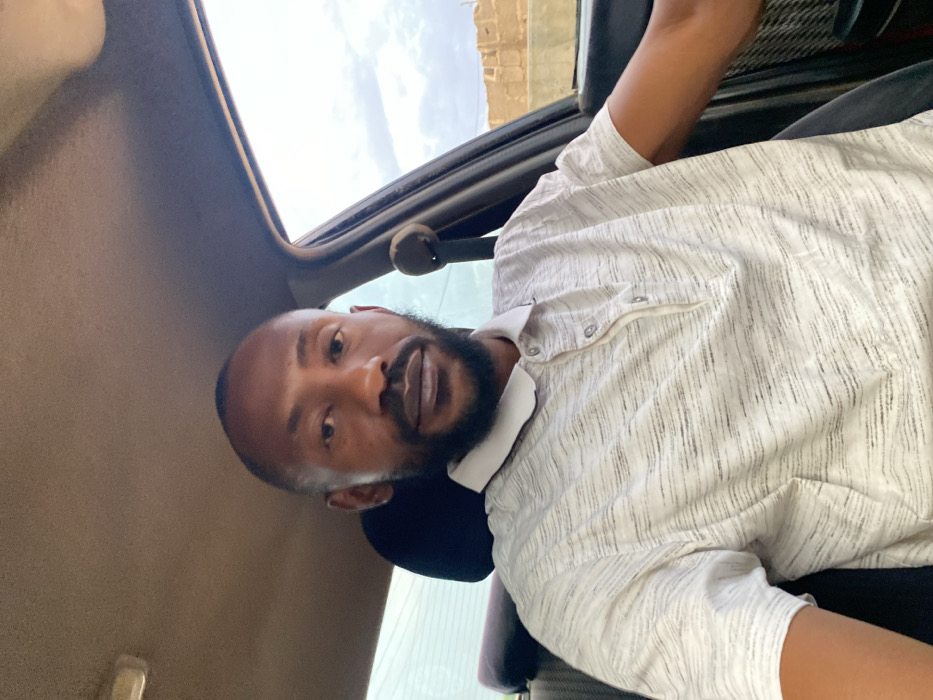 A man sits in a vehicle. He has a beard and is wearing a patterned white shirt with the collar open. The interior of the vehicle is brown. A headrest is visible behind his head. Part of the vehicle's frame and the outside, including part of a building, are visible through the windshield and window. The man appears to be looking toward the camera.