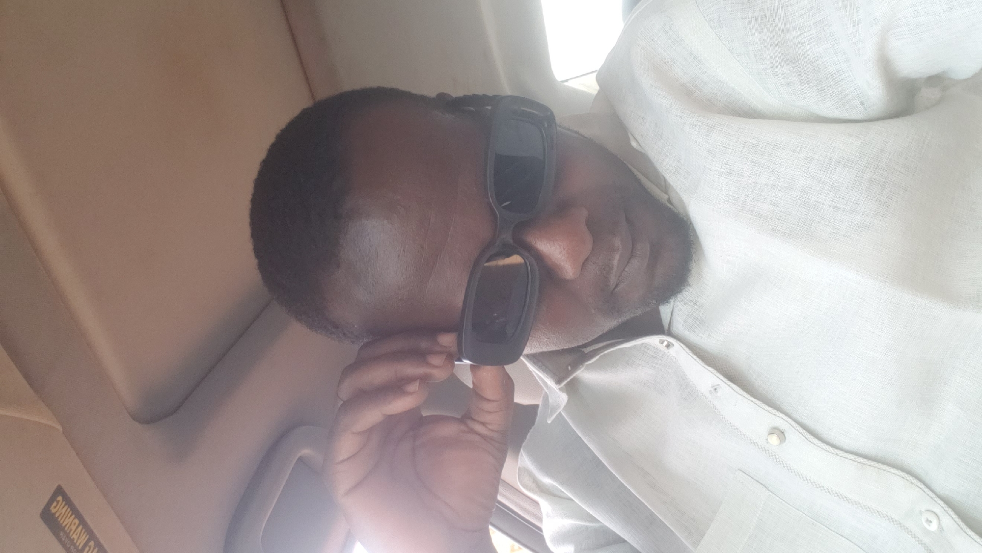 dark-skinned male subject seated within a vehicle, located in Narayi, Nigeria. He has short, dark hair and light facial stubble. The subject is wearing a light-colored, collared button-down shirt with a left chest pocket and visible decorative buttons. He is wearing dark, rectangular-framed sunglasses. His left hand is raised, with fingers positioned on the left side of his head, appearing to adjust or touch the temple of his sunglasses. The subject's head is angled slightly downward and to the right. The immediate environment consists of the vehicle's interior, specifically a light-colored headliner, which displays a reversed "WARNING AIRBAG" label on an overhead component and a subtle outline indicative of a sunroof. The scene is illuminated, with a bright area visible on the left side of the frame.
