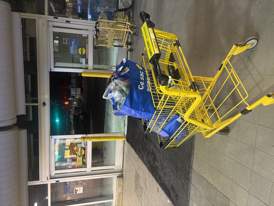 An image shows a yellow shopping cart with blue bags filled with groceries, sitting just outside the entrance of a store