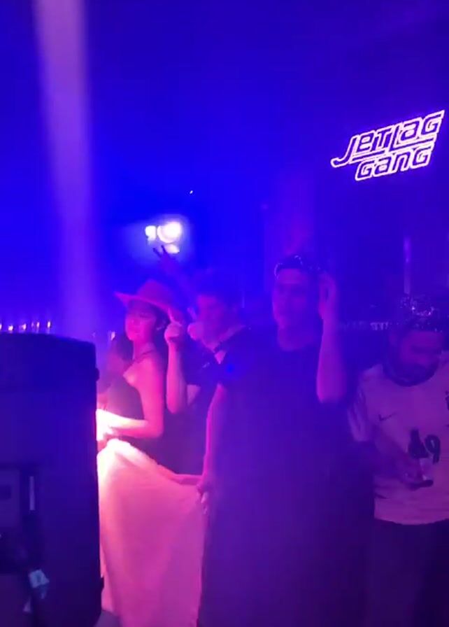 lively scene inside a nightclub with several people. A woman in a black top and red hat stands on a raised platform, draped with a flag. A man stands next to her, waving. The club has a neon sign that reads "Jetlag Gang." Flashing colored lights and smoke effects enhance the energetic atmosphere. One person is seen holding a bottle. The overall impression is of a social gathering with music and dancing.