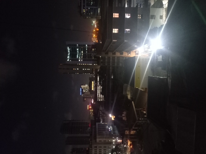 A nighttime cityscape exhibits a cluster of illuminated buildings. Some are tall with many windows, others lower. A large building dominates the upper right, emitting a bright glare. In the distance, faint orange lights line the horizon. The sky is dark and obscured by cloud cover.