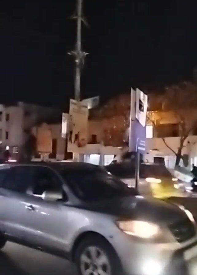 street scene at night. Several cars are visible, including a silver SUV in the foreground. A motorcycle with two riders passes by the SUV. There are buildings and streetlights visible in the background. People can be seen standing on the sidewalk.
