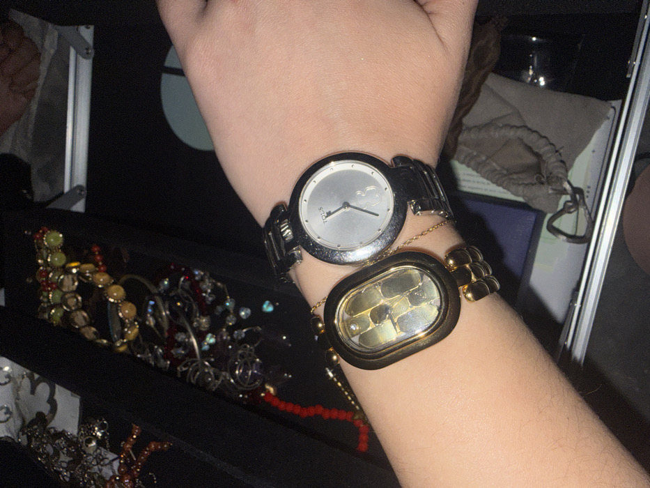 A person’s arm displays two watches. One is a silver-faced wristwatch with a silver band. The other is a gold-colored oval-shaped watch with a gold band. A jewelry box with assorted colorful necklaces and bracelets is in the background. Additional items, including a drawstring bag, are visible beside the arm.