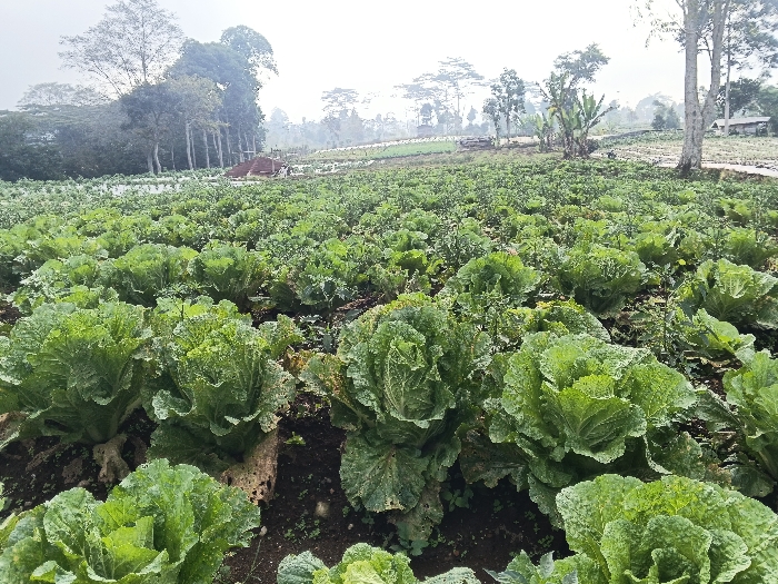 The image displays an expansive agricultural field cultivated with numerous rows of mature, green Chinese cabbage (Brassica rapa subsp