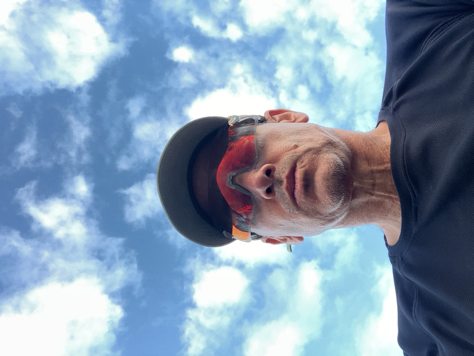 An upward-angle, mid-shot portrait depicts an adult male against a blue sky with scattered white clouds