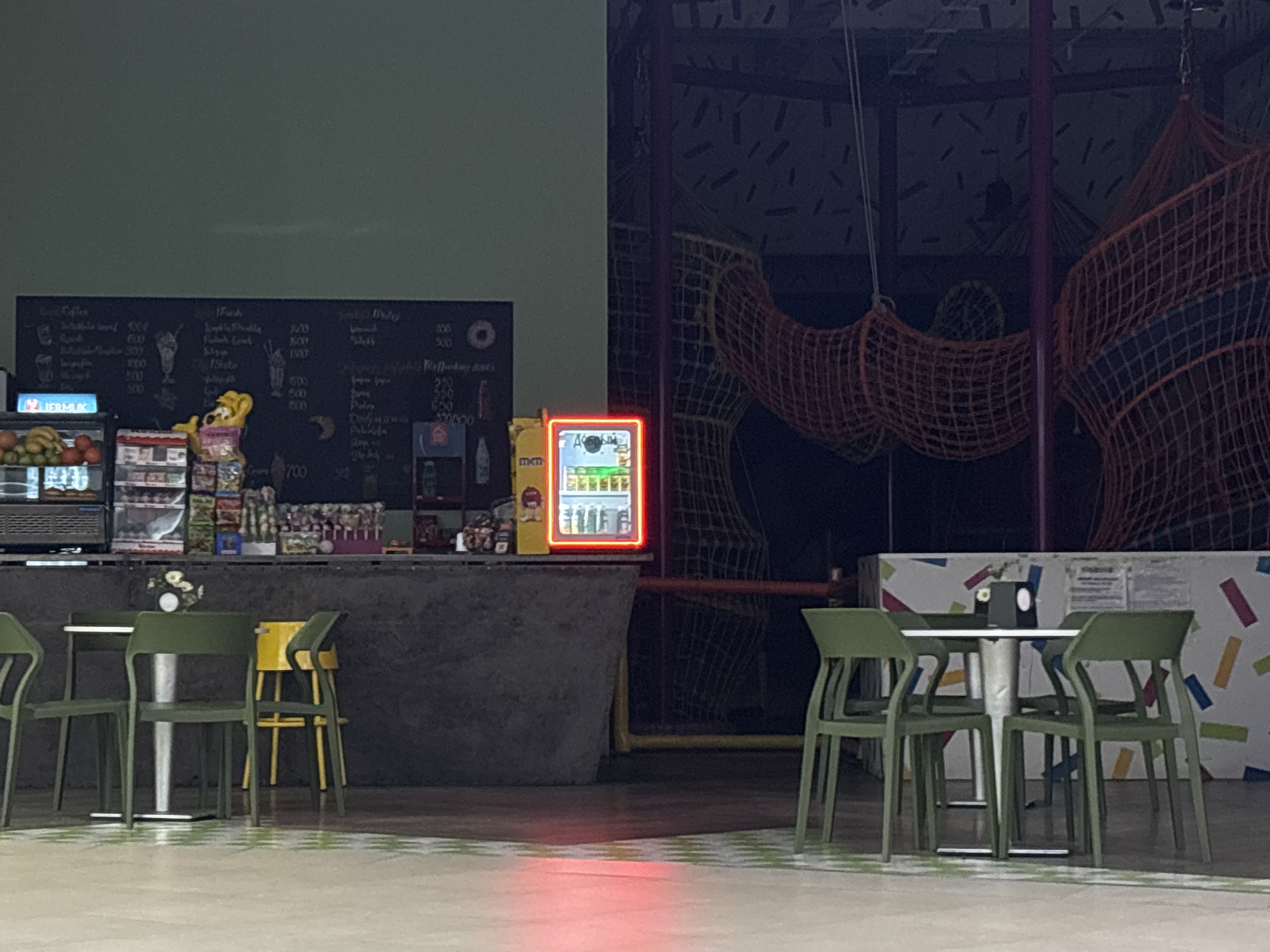 Here is a description of the image: The image shows an indoor seating area near a cafe or restaurant. The cafe area features a countertop with a menu board behind it, listing items such as coffee, fresh juices, and pastries. A refrigerated display case stands near the counter. In the foreground, there are tables and chairs. A table with four green chairs is on the right side of the image, and another table with a mix of green and yellow chairs is visible near the cafe counter. The background reveals a play structure with netting, suggesting the area might be part of an entertainment venue or family-friendly establishment. The image was taken at night.