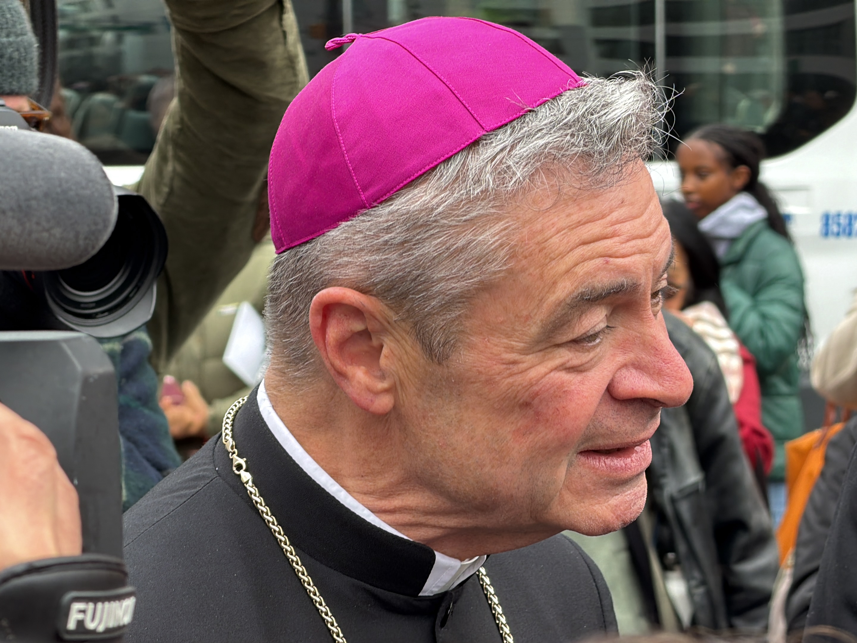 The image captures a close-up view of a Catholic cleric, likely a bishop or archbishop, wearing a distinctive bright magenta zucchetto on his head