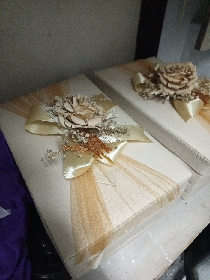 Two elegant, gift-wrapped boxes sit side-by-side. The boxes are cream-colored with a subtle texture. Each is adorned with a large gold ribbon tied into a bow, and a delicate floral arrangement featuring a handcrafted paper rose. The roses are nestled among small dried flowers and foliage, adding a touch of rustic charm. A soft, sheer gold fabric is draped around each box, further enhancing the luxurious presentation. The boxes appear to be on a shelf or table in a dimly lit room.
