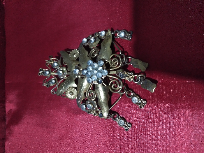 - "The image displays an ornate, antique-style metal brooch or pendant centered on a deep red fabric background, exhibiting visible folds and creases" by FM-HOzxy1, licensed under CC BY 4.0