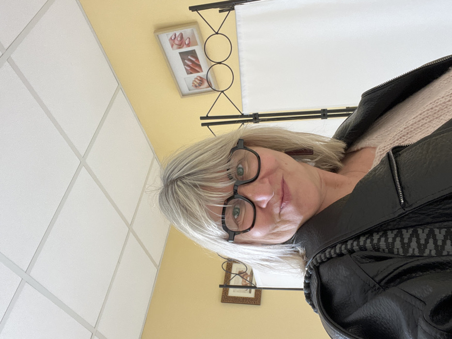 An indoor scene in Montrond-les-Bains, France, depicts a woman in a frontal pose, looking directly at the camera with a slight smile. She has light blonde and grey, shoulder-length hair with bangs and wears dark-framed, octagonal glasses. Her attire includes a black, shiny, zippered jacket over a light pink knitted garment. A grey and black patterned strap is visible over her right shoulder. A reddish-brown earring is present in her visible right ear. The background features pale yellow walls and a white suspended ceiling with a grid pattern. On the left wall, a brown-framed picture displays an image, possibly an animal. On the right, a black metal room divider with white fabric panels is partially visible. Behind this divider, a light-framed picture on the wall contains three distinct images of manicured nails.