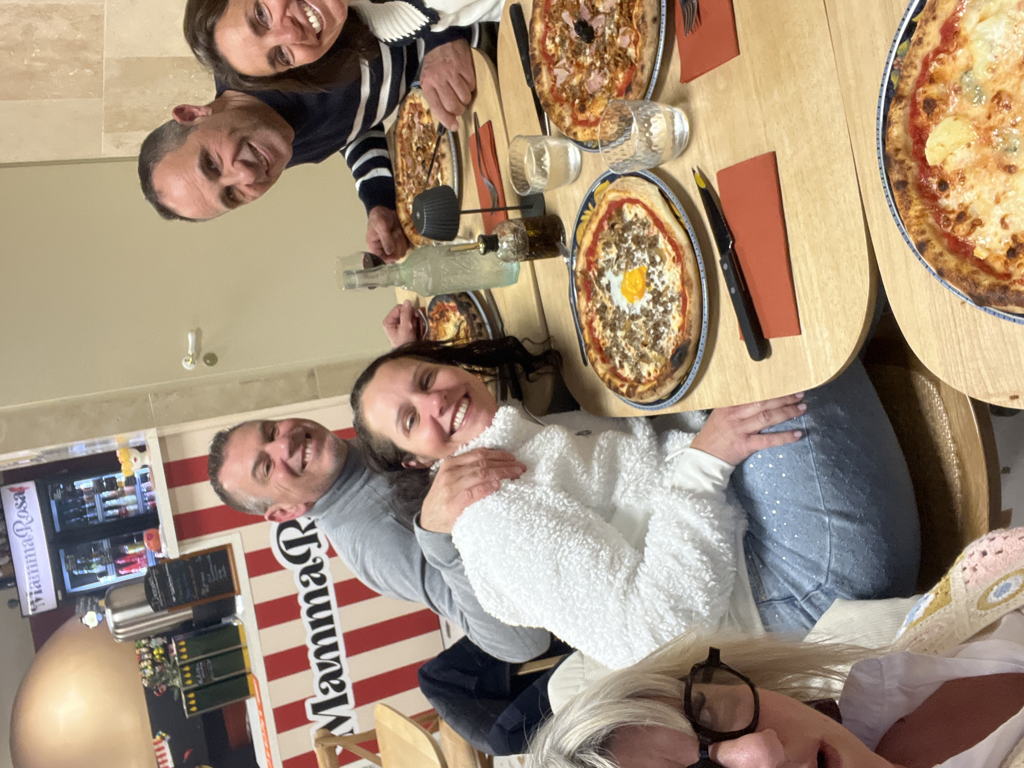 A group of five adults is captured seated around a light-colored wooden table inside the Mamma Rosa restaurant in Saint-Galmier, France