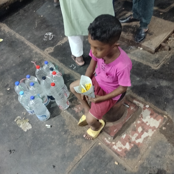 The image depicts a young boy, approximately 5-7 years old, with dark hair, wearing a short-sleeved pink shirt and reddish-brown shorts, along with yellow sandals. He is seated on a low, dark cylindrical object on a grimy, dark grey paved surface. In his left hand, he holds a white paper cone filled with yellow, kernel-like food items. To his left, a cluster of eight clear plastic water bottles with various colored caps (red, blue, black) are loosely grouped together, some appearing to be partially empty. Several small pieces of white and brown debris are scattered on the ground near the bottles. The lower legs and feet of two adults are partially visible in the upper right and left portions of the frame. One person wears a light green garment, white pants, and brown sandals; the other wears dark pants and black dress shoes. The ground shows patches of lighter, reddish-brown discoloration and what appear to be two square metal plates with circular openings. The scene is outdoors, likely in a public area in the city of Lalmohan, Bangladesh.