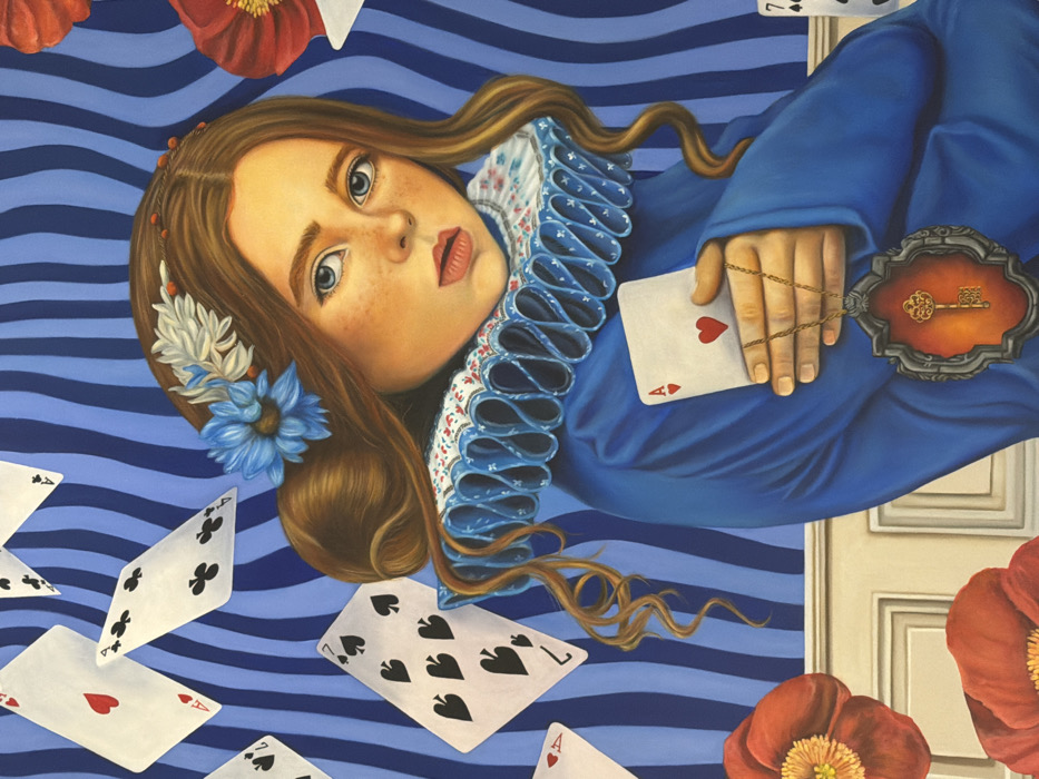 This image is a detailed painting, referenced as being located in Mexico City, Mexico. It depicts a young girl, viewed from the chest up, with fair skin, light freckles across her nose and cheeks, blue eyes, and long, wavy reddish-brown hair. Her hair is adorned with two blue flowers, white feathery elements, and a thin red-beaded headband. She wears a vibrant blue long-sleeved garment and a prominent ruffled white collar with blue trim and subtle floral patterns. Her left hand is positioned over her chest, holding an Ace of Hearts playing card. Draped from her left hand, beneath the card, is a golden chain suspending a large, ornate, dark-framed pendant. Within this pendant, a golden skeleton key is centered against a glowing orange background. The background features undulating vertical stripes in two shades of blue. Several playing cards, including Aces of Spades, a 7 of Spades, and a 4 of Clubs, are depicted as if floating or falling through this striped background. Large, vibrant red poppies with yellow centers are visible in the lower left and upper right corners of the composition. A segment of a white architectural element, resembling wainscoting or a door frame, is present in the lower left corner.