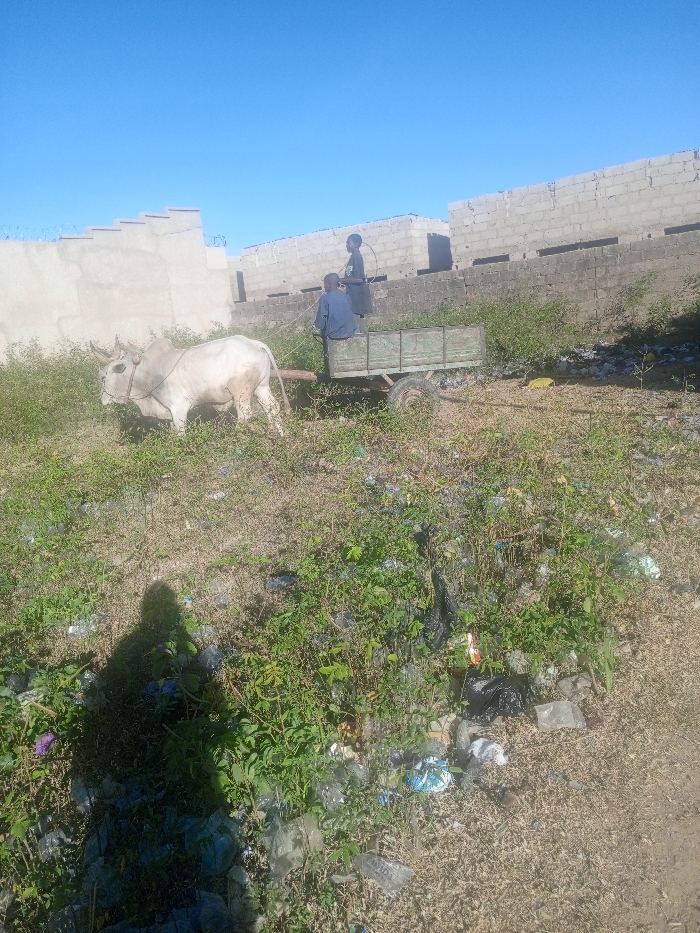 A rural scene unfolds under a bright blue sky. A white bull pulls a small, green cart, upon which two young individuals are riding. The landscape is overgrown with green vegetation and littered with trash. A wall of gray cement blocks forms the backdrop. The shadow of the photographer is visible in the bottom left corner.