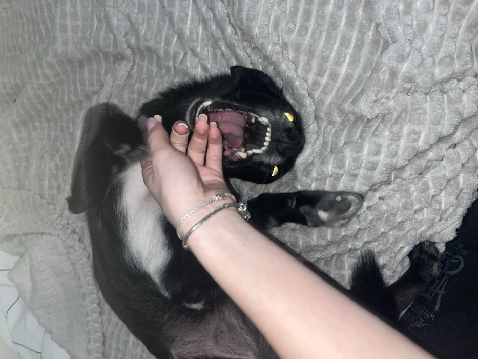 An indoor scene within the city of Unknown, Unknown, shows a black and white dog lying on its back on a light gray, textured blanket. The dog's mouth is wide open, exposing white teeth and a pink tongue, with prominent yellow-orange eye reflections from flash photography. A fair-skinned human arm, wearing two silver-colored bracelets, extends over the dog. The human hand, with manicured, light-colored fingernails, is interacting with the dog's lower jaw near its open mouth. The environment appears dimly lit.