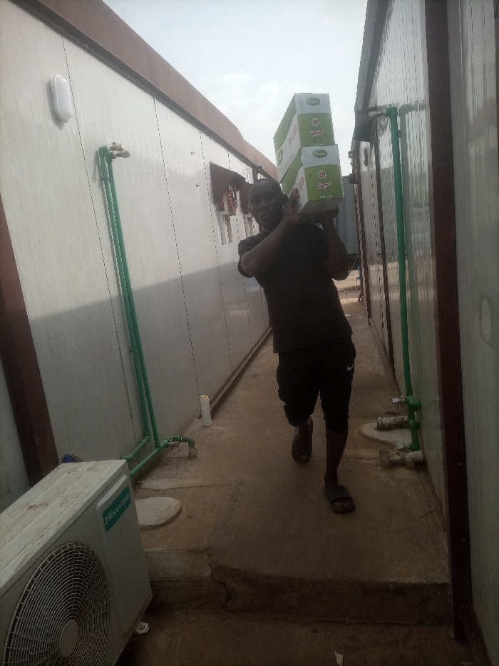 The image depicts a male individual navigating a narrow concrete pathway between two parallel, light-colored modular structures in Opete, Nigeria