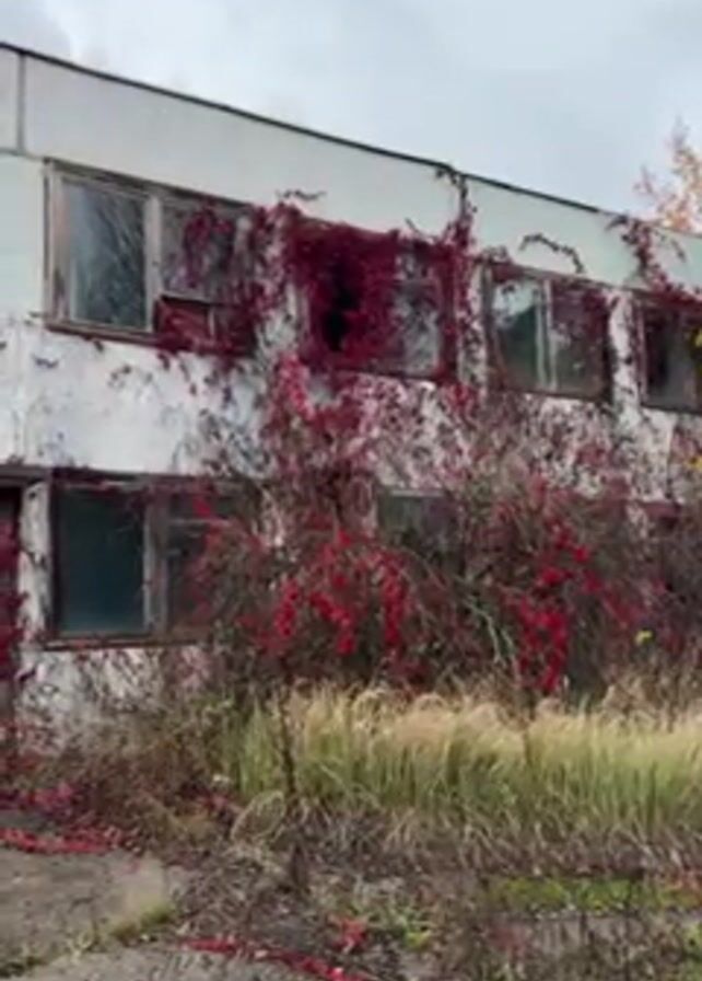 exterior of a two-story abandoned building with a flat roof under an overcast sky. The building is light gray or white, and the window frames appear weathered. Vines with vibrant red leaves and berries heavily cover portions of the building's facade, climbing around the windows. Tall grasses and overgrown vegetation surround the base of the building, obscuring the foundation. There's an open doorway visible on the ground floor, revealing a glimpse of the interior, including a chair and debris. Red leaves are scattered on the ground near the building. The overall impression is one of neglect and abandonment.