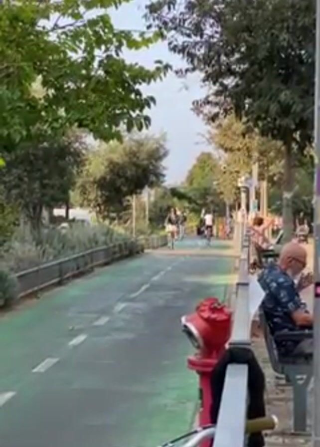 A person is filming from a low angle behind a grey railing. A bicycle leans against the railing in the foreground. In the background, a green bike lane stretches into the distance with trees lining both sides. People are riding bicycles on the bike lane. There is a red fire hydrant near the railing. A man is sitting on a bench to the right, looking at a device. Other people are sitting on benches in the distance. The sky is visible in the background.