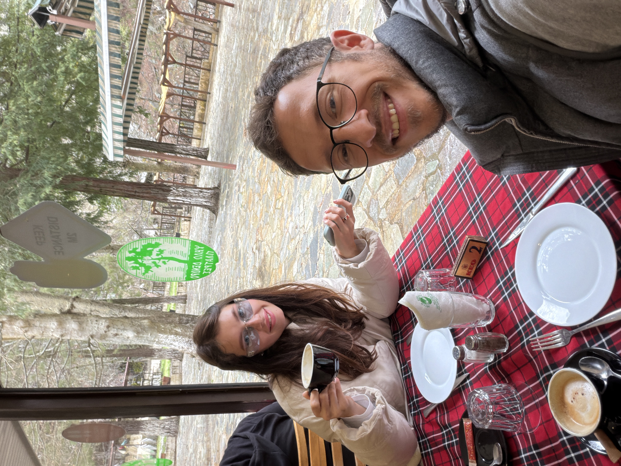 A selfie photograph shows a man and woman at a table in what is possibly a restaurant or café. The man is on the right, holding a phone up to take the photo, with a wide smile. He has short dark hair, glasses, and is wearing a gray jacket. The woman is seated across from him, holding a coffee cup, smiling, and wearing a beige jacket and glasses. The table is covered with a red and black plaid tablecloth, set with plates, silverware, glasses, salt and pepper shakers, sugar packets, and cups of coffee. A small wooden table number is visible. A window is to the left of the frame, through which an outdoor scene is visible. The window has a sticker with green branding and text written in Greek. The outdoor scene includes trees and a building with a striped awning. The setting is likely Pano Platres, Cyprus, based on the text on the sticker.