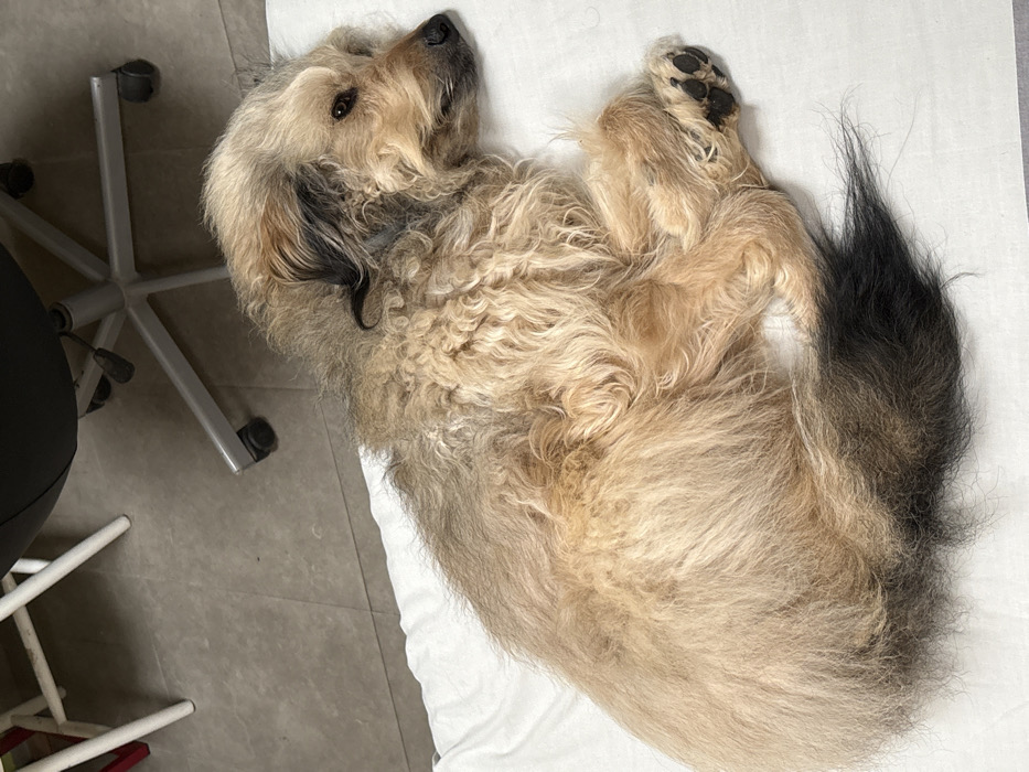 - "A domestic canine, characterized by shaggy, multi-toned fur predominantly light brown and tan, with darker coloration on its ears and the distal section of its tail, is depicted in a recumbent position" by FM-wE9nL2, licensed under CC BY 4.0