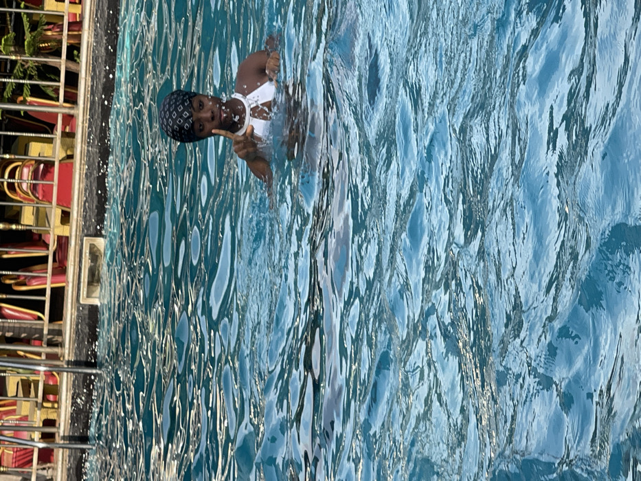 An outdoor swimming pool in Onitsha, Nigeria, is depicted with clear, blue-tinted water exhibiting surface ripples