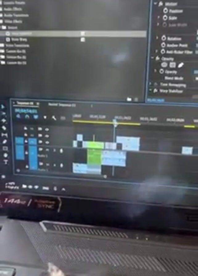 A person is editing a video on a laptop. The video editing software appears to be Adobe Premiere Pro. The timeline shows multiple video and audio tracks. The video preview displays a scene with three men in suits, likely at an event with sparklers. The person holds a lit cigarette in their hand while working on the computer. The laptop is black with an ASUS logo.