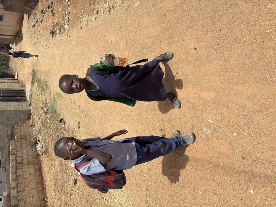 An outdoor scene in Jos, Nigeria, depicts two children and a third distant figure on an unpaved, reddish-brown dirt path under bright sunlight, casting sharp shadows. On the left, a boy, approximately 6-8 years old, wears a light blue short-sleeved shirt, dark blue trousers, and grey slip-on shoes, with a red and black backpack. He holds a small, clear, cylindrical object to his right eye. To his right, a girl, approximately 5-7 years old, wears a dark blue sleeveless tunic over a green long-sleeved shirt and dark flat shoes, carrying a dark backpack. She holds a clear plastic bottle with an orange "Fanta" label in her left hand. Both children are positioned towards the camera. In the background, a person in a dark dress walks away down the path. The environment includes unrendered concrete block structures bordering the path on both sides, with sparse dry vegetation and scattered debris, including refuse and black burnt patches, along the verges.