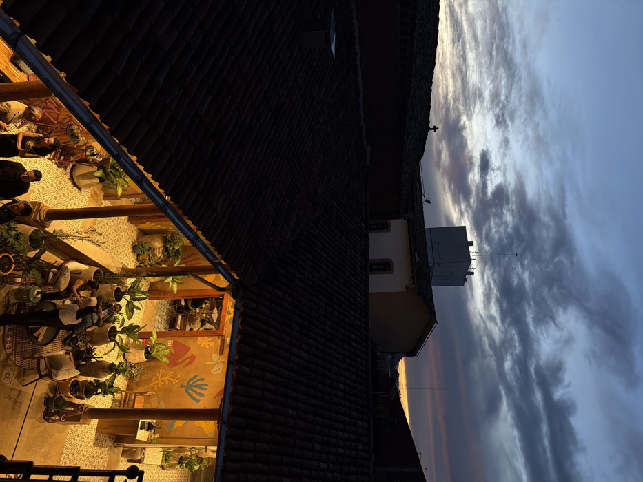 An elevated view of a courtyard gathering beneath a tiled roof, illuminated with warm light amid potted plants and patterned flooring. Adjacent, a dark, tiled rooftop leads to a building with a white structure. The sky features a gradient of colors, from dusky orange near the horizon to a pale blue speckled with clouds.