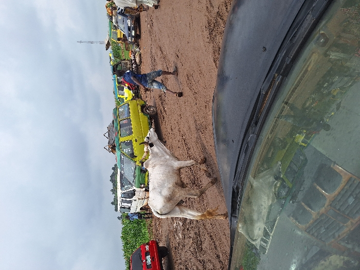 The image depicts a muddy, unpaved outdoor area in Kujama, Nigeria, under an overcast sky. In the foreground, the dark hood and lower windshield of a vehicle are visible, reflecting interior elements. Midground elements include a light-colored, short-horned cow walking from left to right, its lower legs coated in mud. To the cow's right and slightly behind it, a male individual in a blue short-sleeved shirt, torn light-colored trousers, and sandals walks in the same direction, with a red item draped over his left shoulder. Multiple vehicles are present on the muddy ground. A red SUV is partially visible on the far left. Central to the scene are a white van, a green van, and several yellow vans, one with items secured to its roof. Further to the right, additional yellow vans and a dark blue sedan are visible. Sacks and piles of produce are scattered on the ground around the vehicles, suggesting a market or loading zone. The background features dense green vegetation along the left and distant horizon, and a tall metal lattice tower stands on the right side of the scene. The ground is extensively muddy with visible tire tracks.
